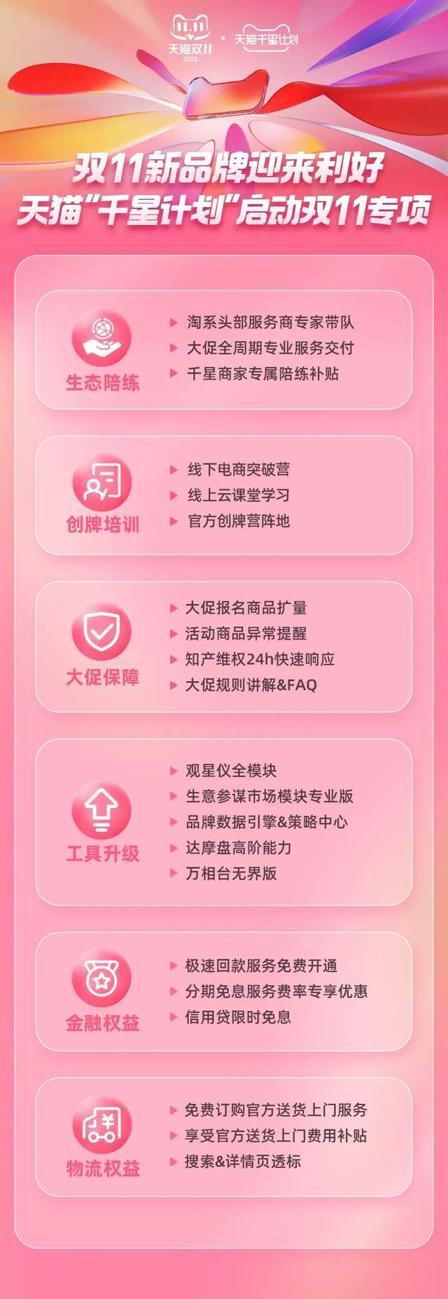 10月11日消息,天猫扶持新品牌的“千星计划”启动双11专项扶持,联合14家头部服务商,为参加双11的新品牌提供全程陪练;同时推出涵盖创牌培训、大促保障、工具升级、金融权益和物流补贴等6大举措,护航新品牌在天猫双11实现高增长。
