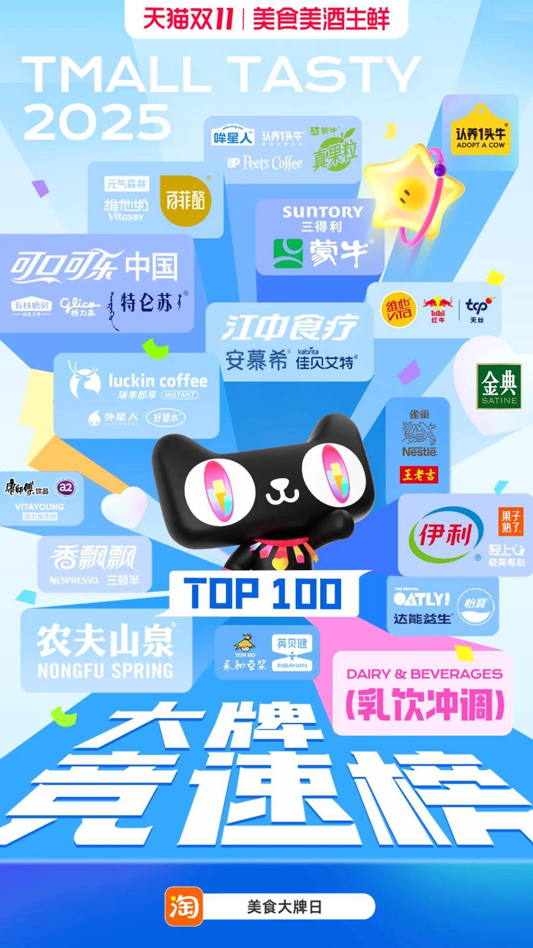 其中,雀巢食品代言人孙颖莎官宣新品,双11期间天猫端销售额突破1000万元,带动新客增长超过100%;瑞幸咖啡联名“王者荣耀”等热门IP发布新品,成交额4天突破千万元,排名天猫食品卡券类目Top 3;十月稻田首周销售额超千万元,累计GMV达到去年双11全期1.2倍。八马茶业、瑞士莲、湾仔码头等品牌也借助爆品势头,跑出了亮眼增速。