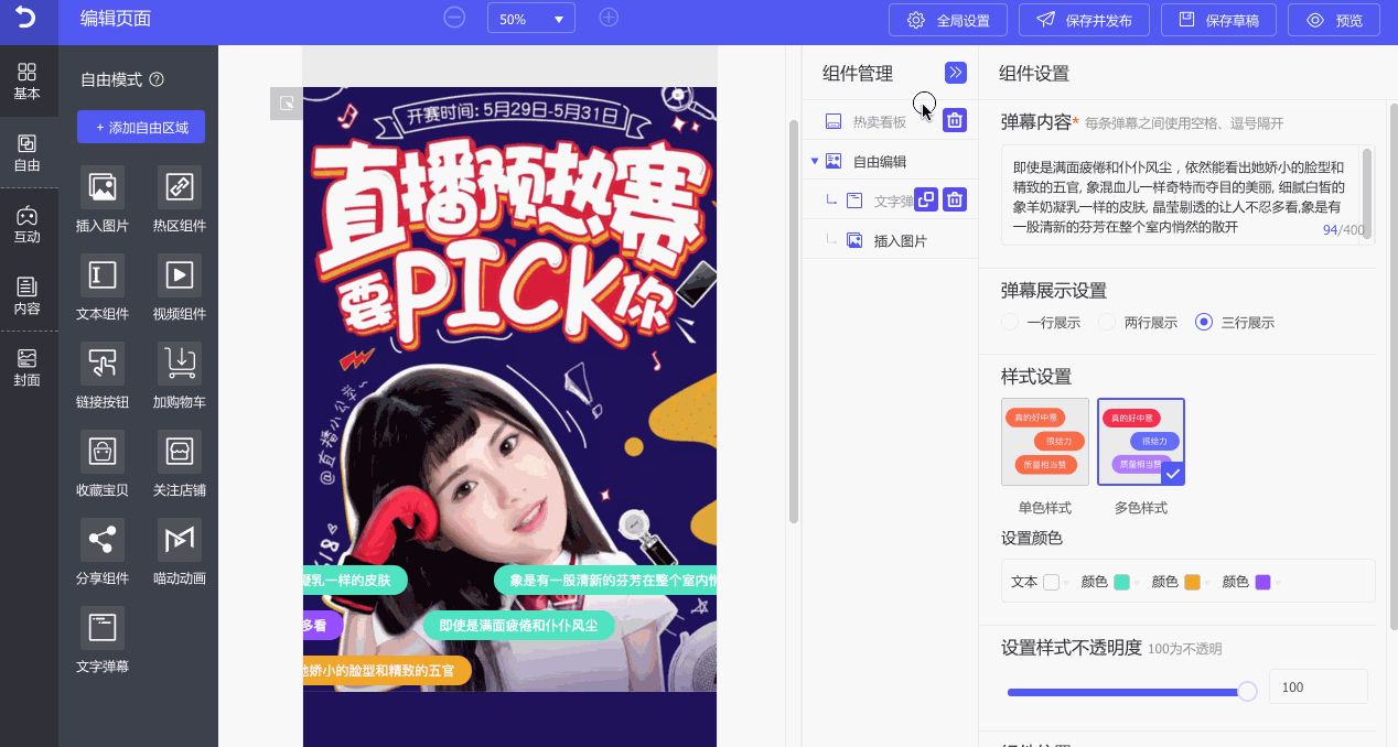 功能路径:淘积木_长图页面编辑器_自由_弹幕组件